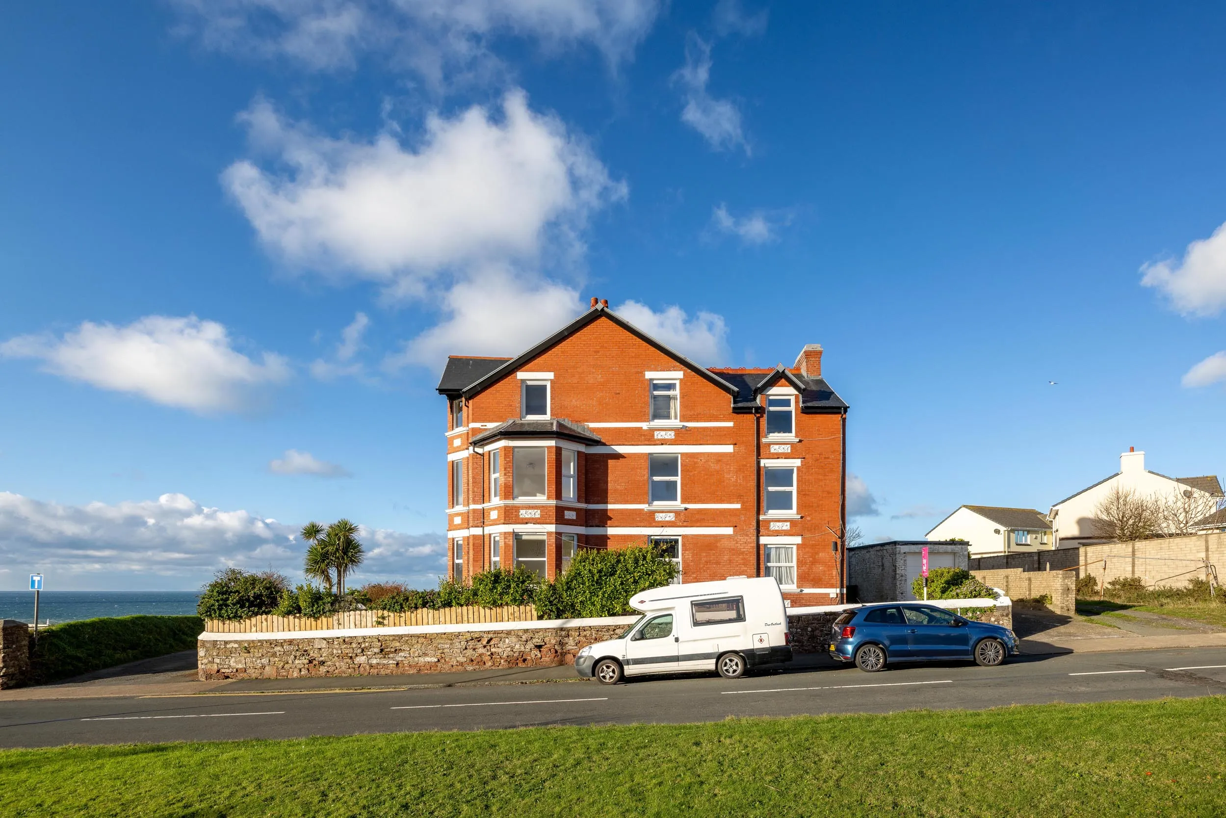 A welcoming entrance hallway with storage cupboard leads to a stunning living room, featuring dual bay windows, with the front bay perfectly positioned to take full advantage of the breathtaking views.