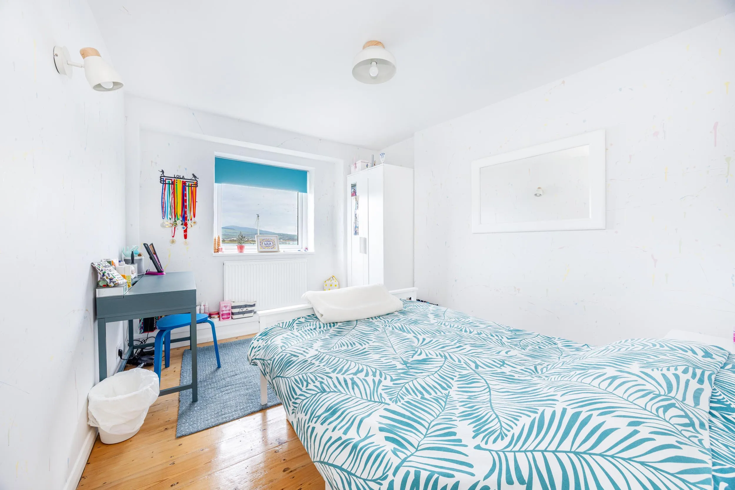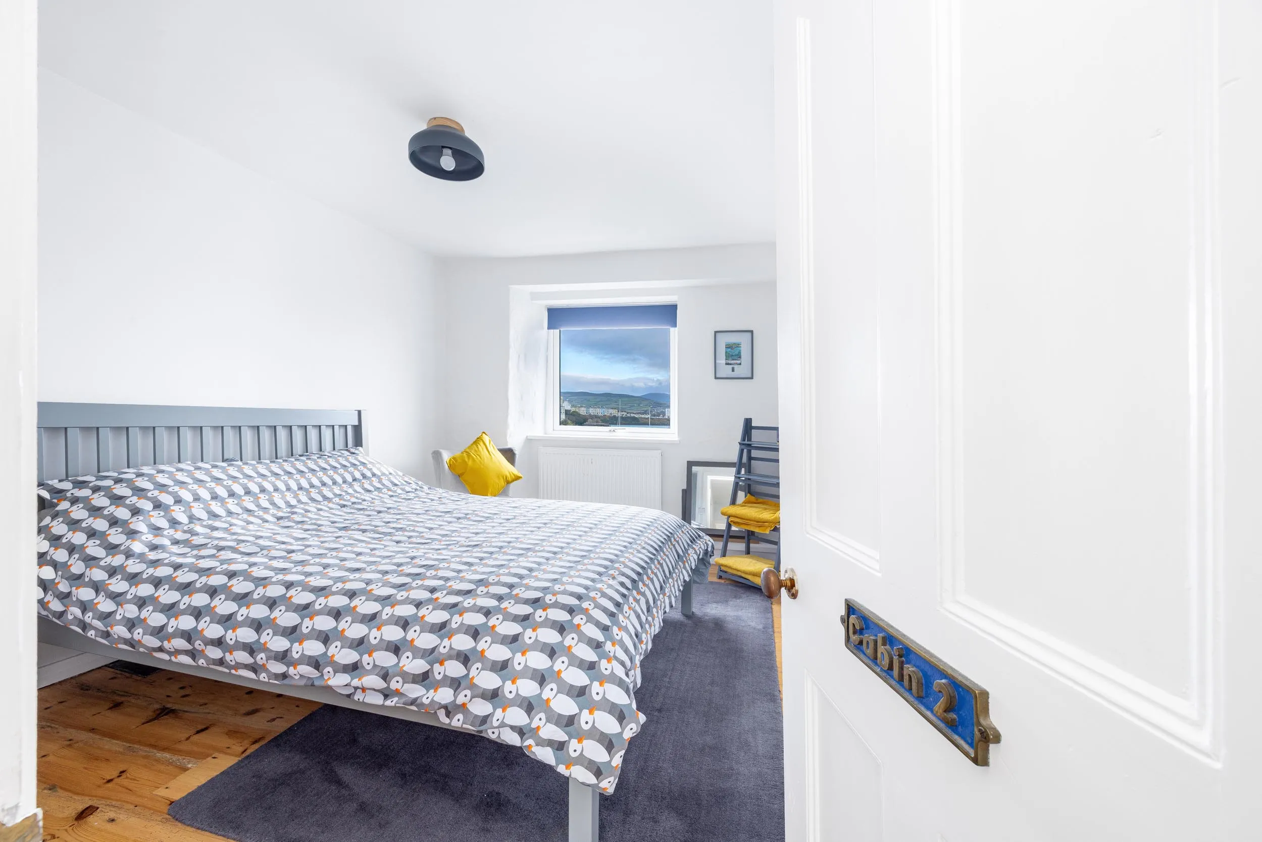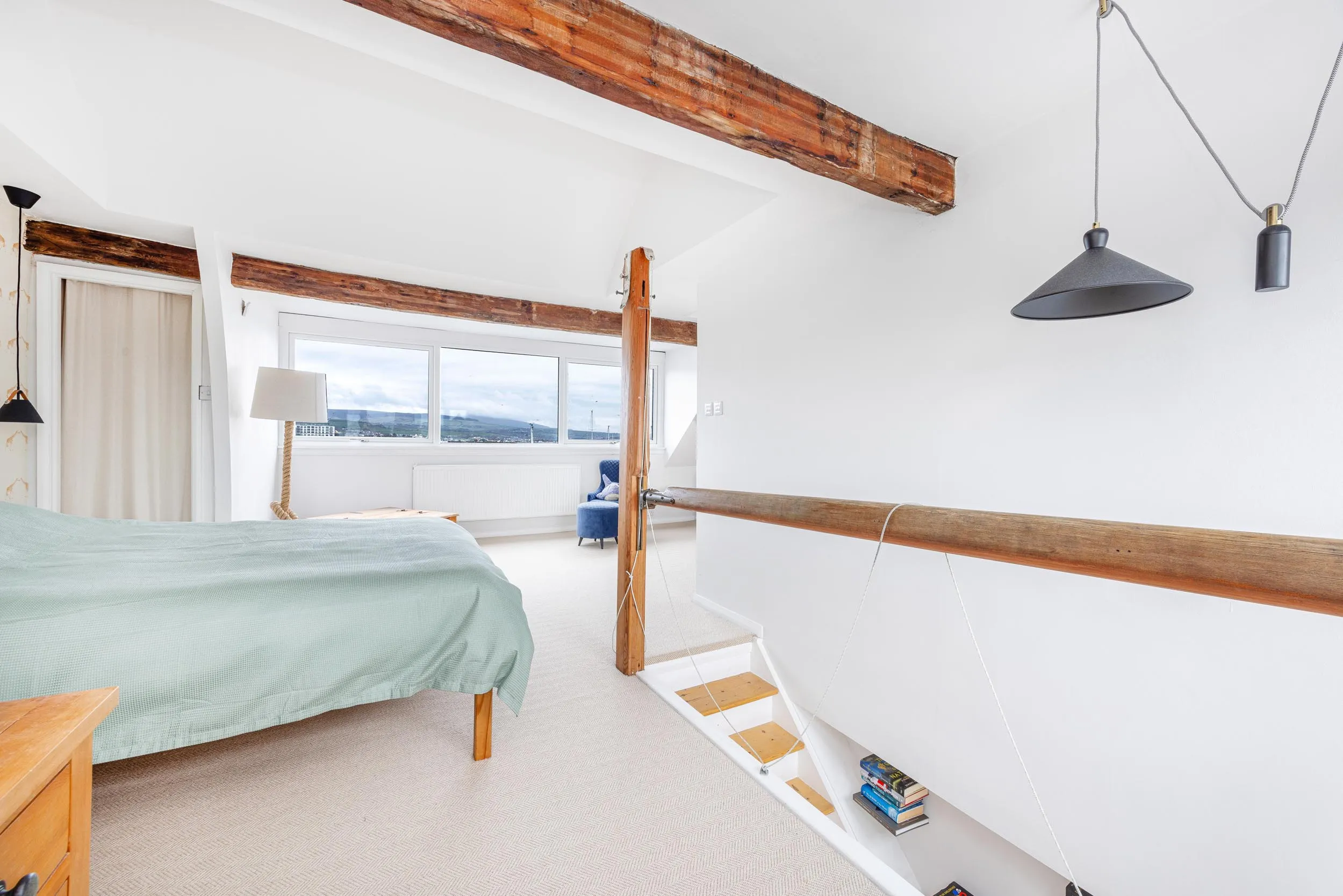 To the first floor is a superb open-plan living area incorporating an open-tread staircase and study space. Extensive glazing to the front elevation provides breathtaking panoramic views across Port St Mary harbour and floods the space with natural light.