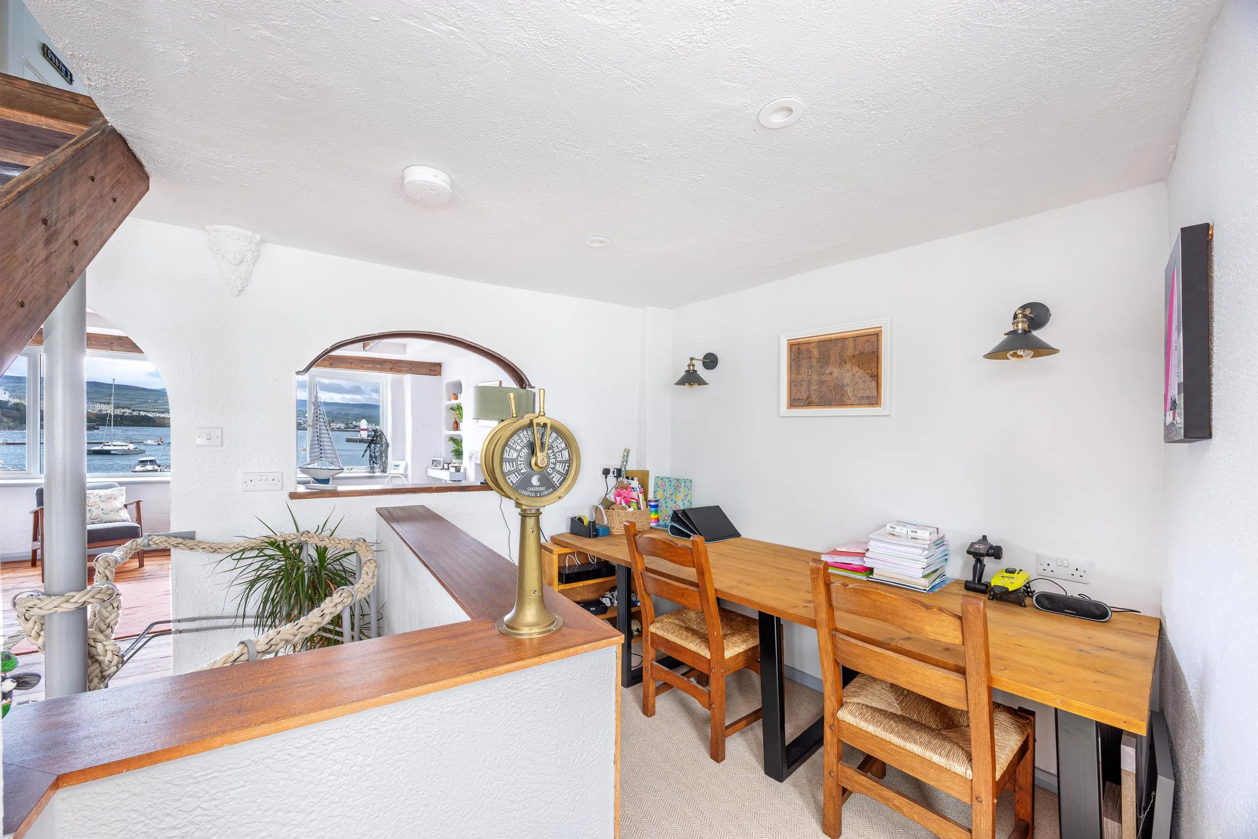 - Superb first floor open plan living area with open plan staircase and study area and there is large glazing to the front aspect providing panoramic views over Port St Mary harbour