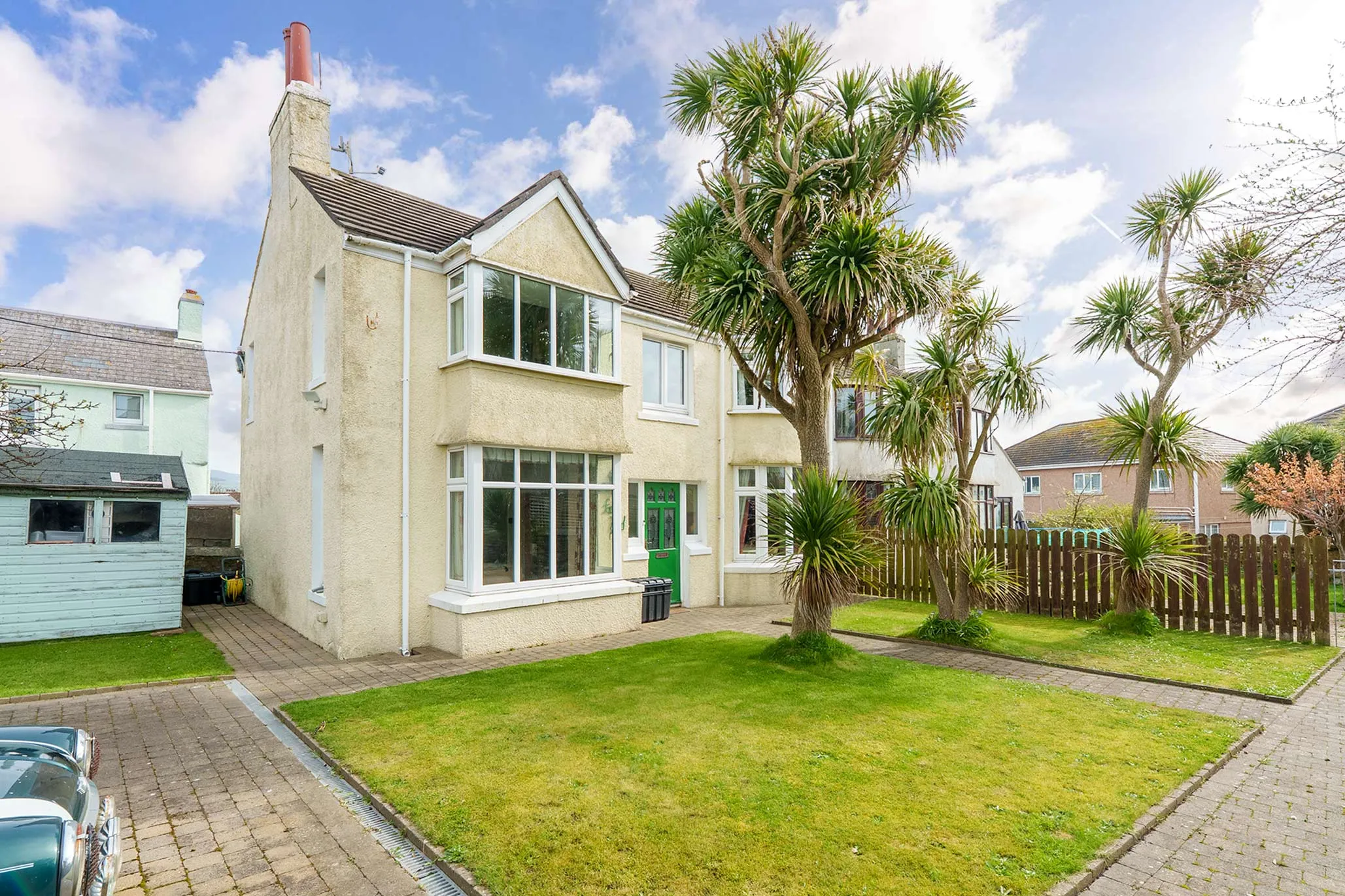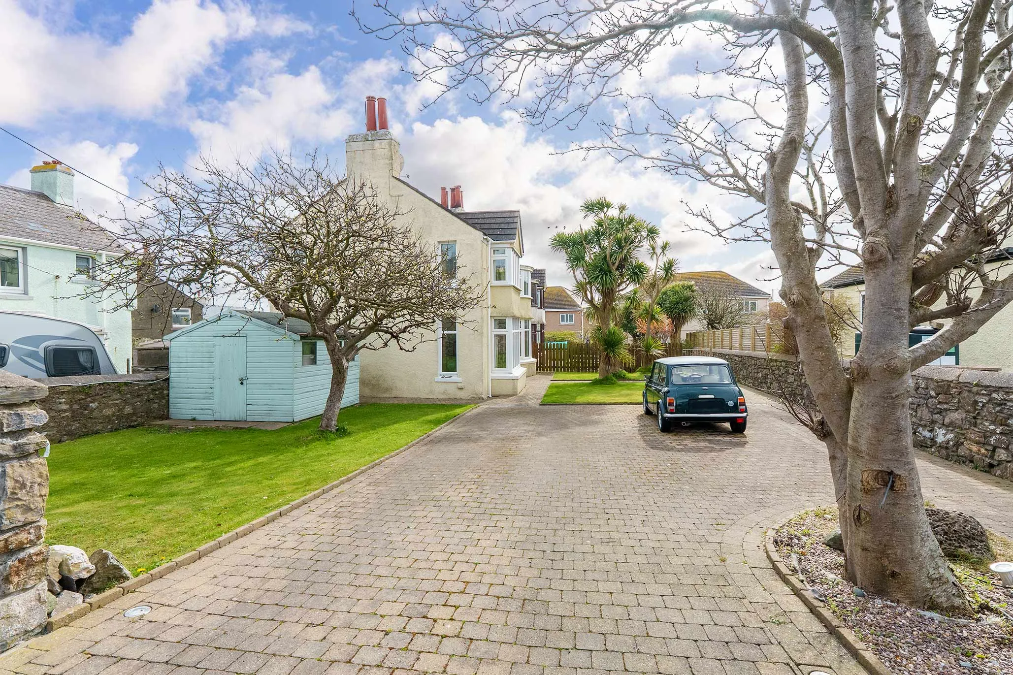 - Extensive block paved driveway with parking for multiple cars and mature trees and shed to the front of the property
