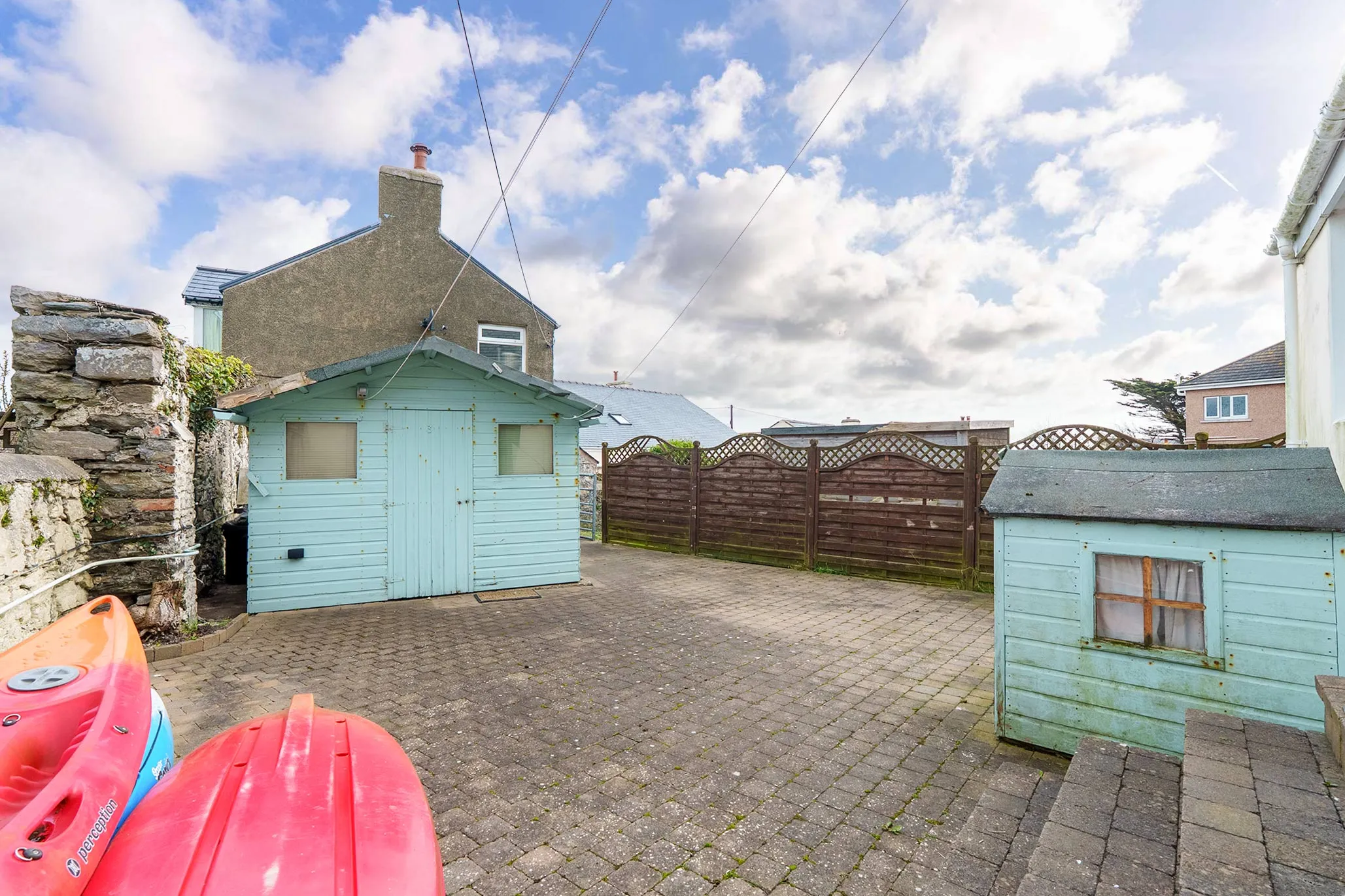 Externally, the property boasts an extensive block-paved driveway to the front, providing off-road parking for multiple vehicles, along with mature trees and a storage shed. To the rear is a further low-maintenance block-paved area with an additional storage shed, as well as vehicle access via a gate and a right of way.