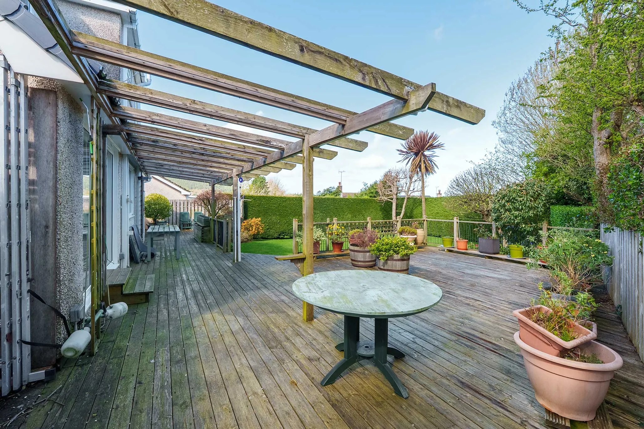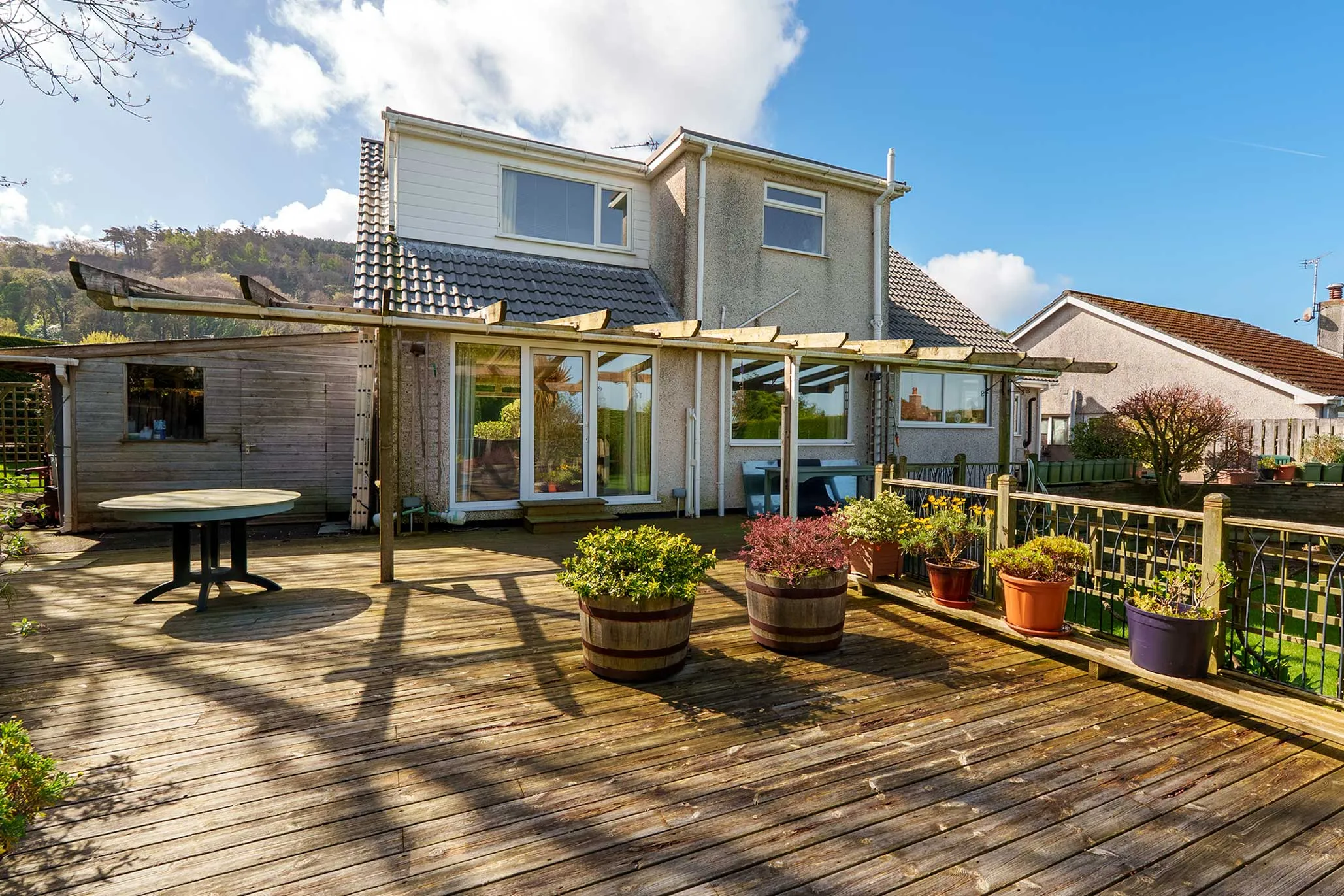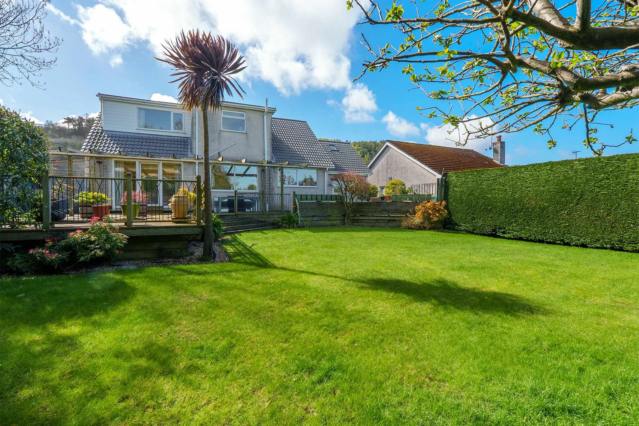 - Mature gardens with established borders creating a high degree of privacy, mainly laid to lawn with extensive raised decking area