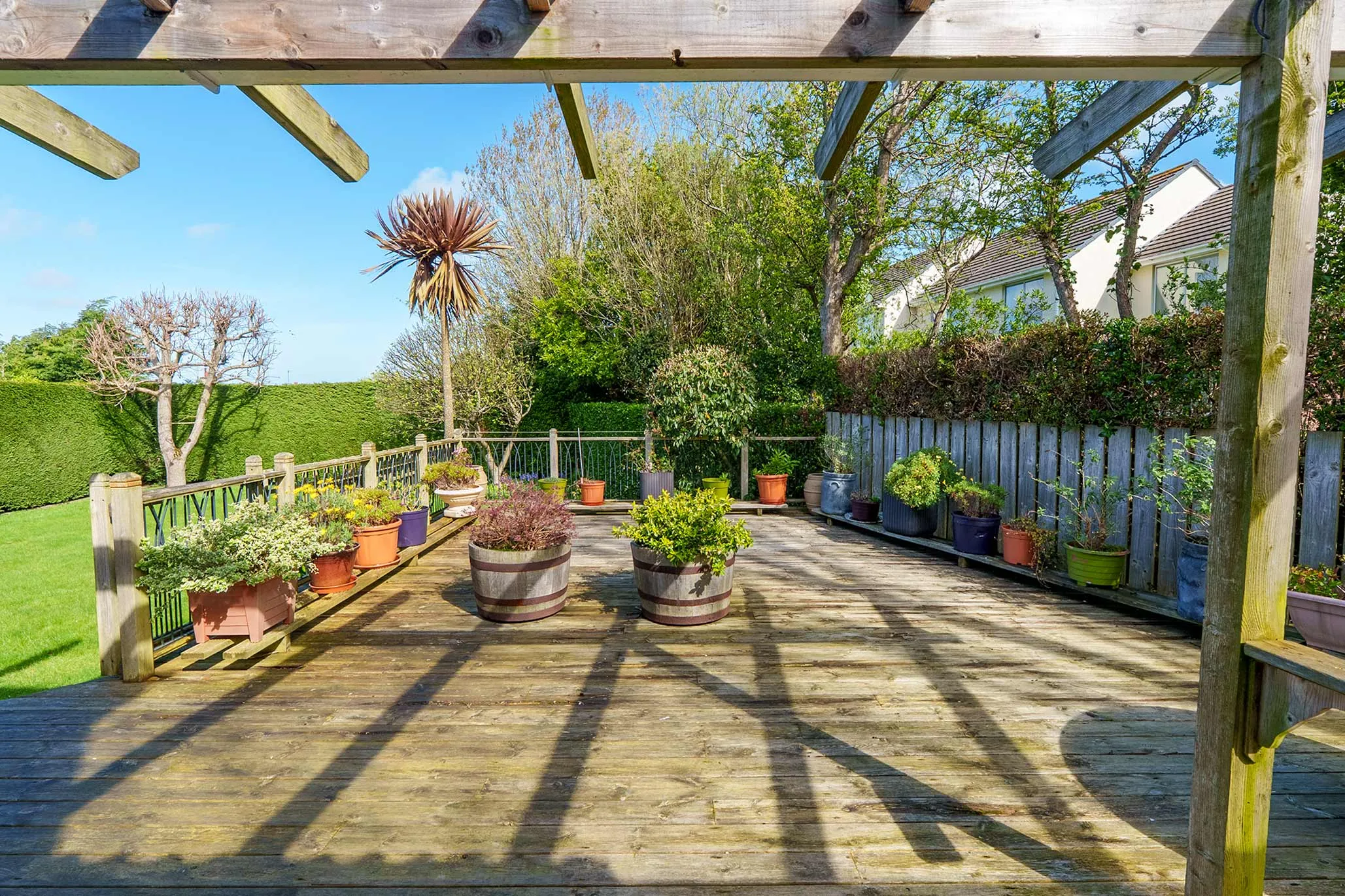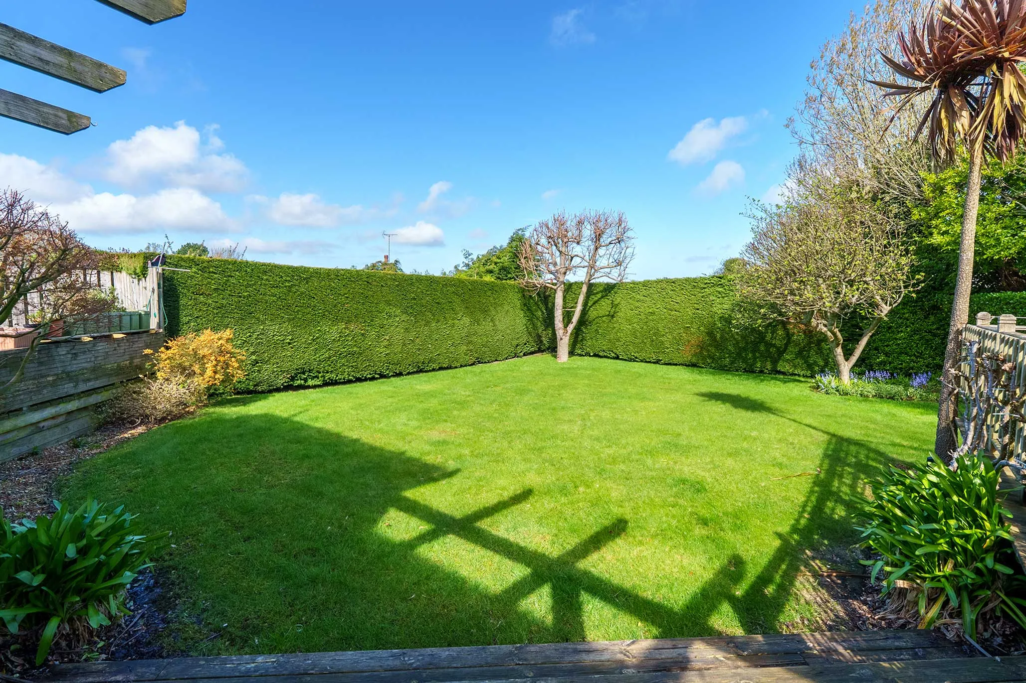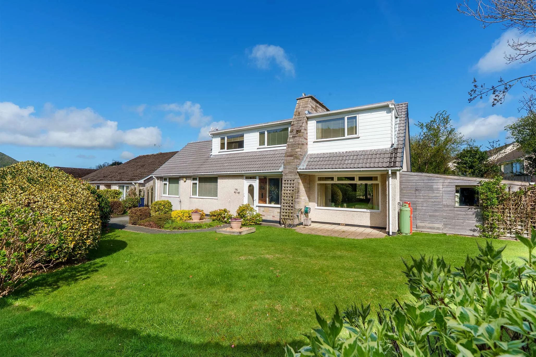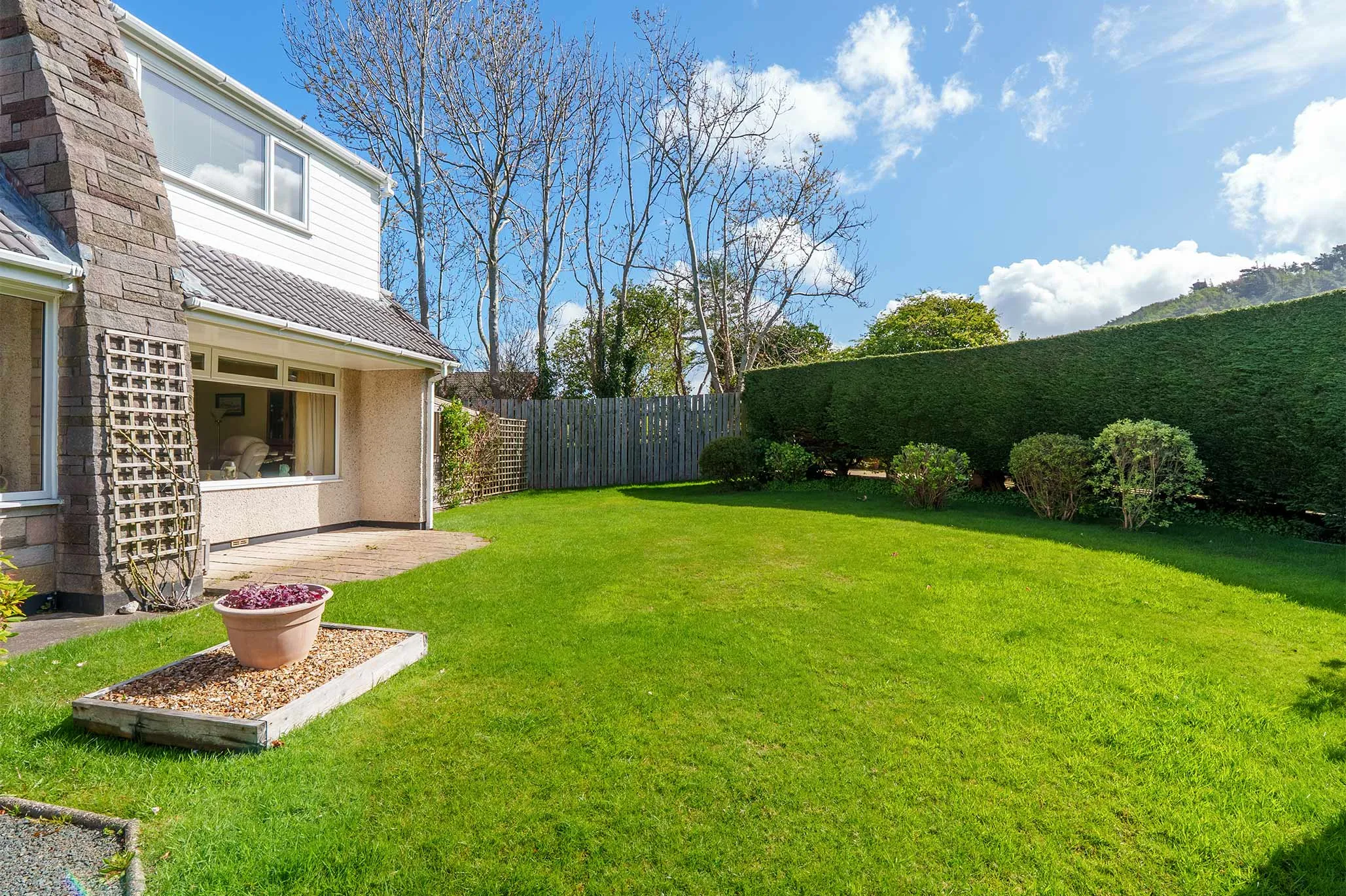 - Mature gardens with established borders creating a high degree of privacy, mainly laid to lawn with extensive raised decking area