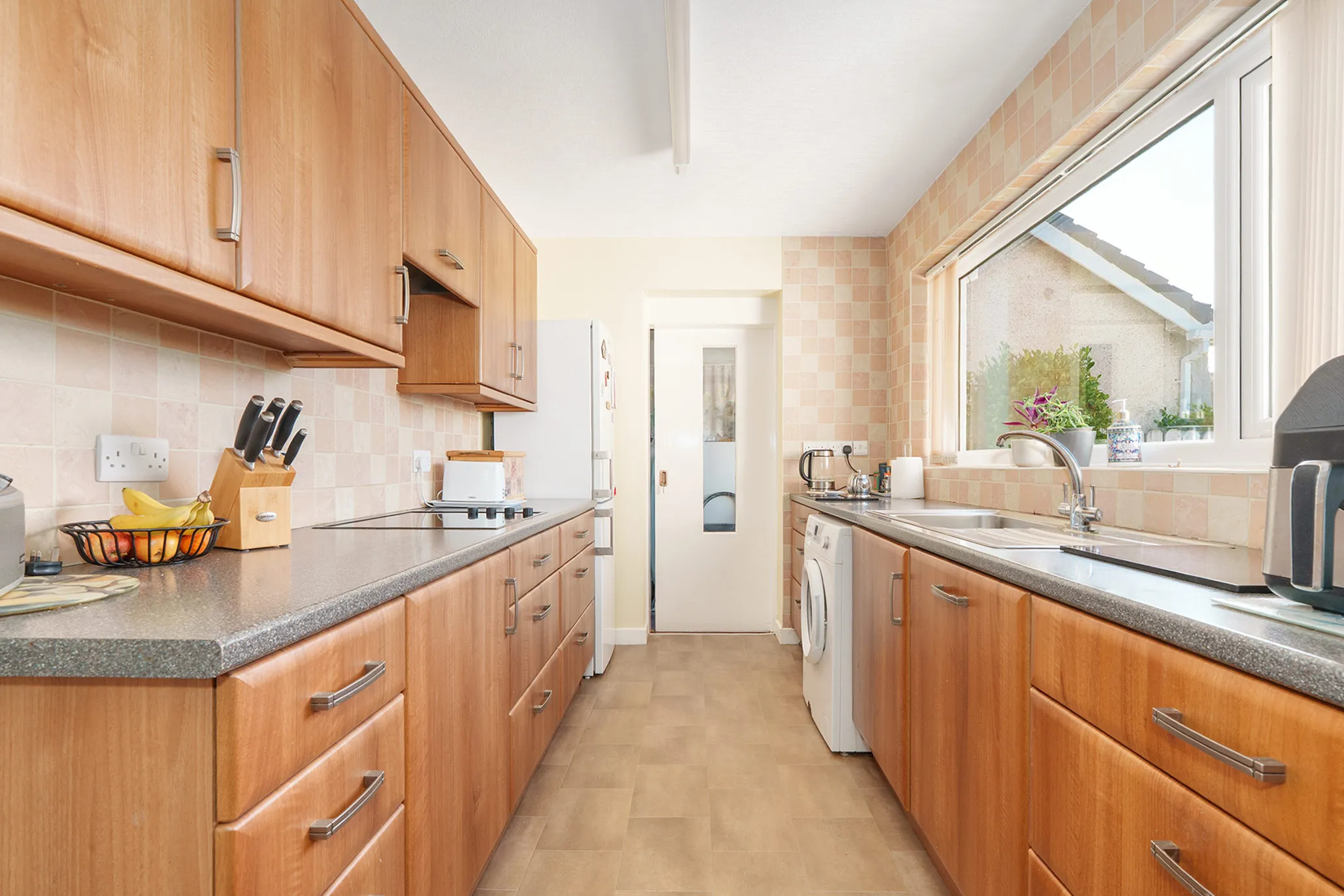 Set on a good-sized plot, the accommodation begins with a large entrance hallway featuring two useful storage cupboards. The living room flows through to a sun room extension, which benefits from a roof light and provides access to the rear garden, creating a pleasant additional reception space filled with natural light. There is also a separate kitchen and a utility room with side entrance, offering practical day-to-day convenience.