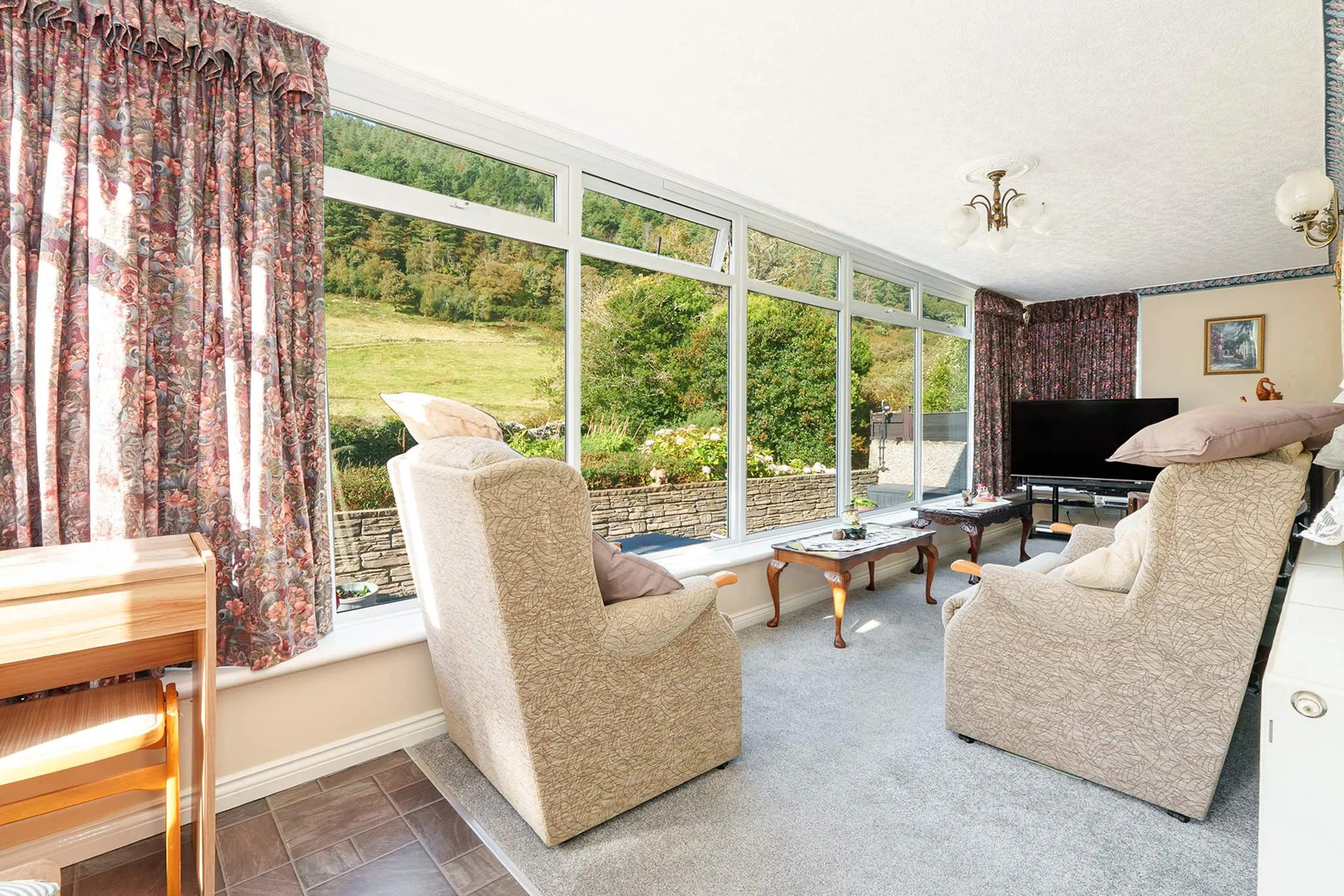 The accommodation is both spacious and versatile, comprising an entrance porch and a welcoming hallway leading to three reception areas: a comfortable living room, a formal dining room, and a delightful sunroom that takes full advantage of the far-reaching views. The separate kitchen provides ample space and functionality.