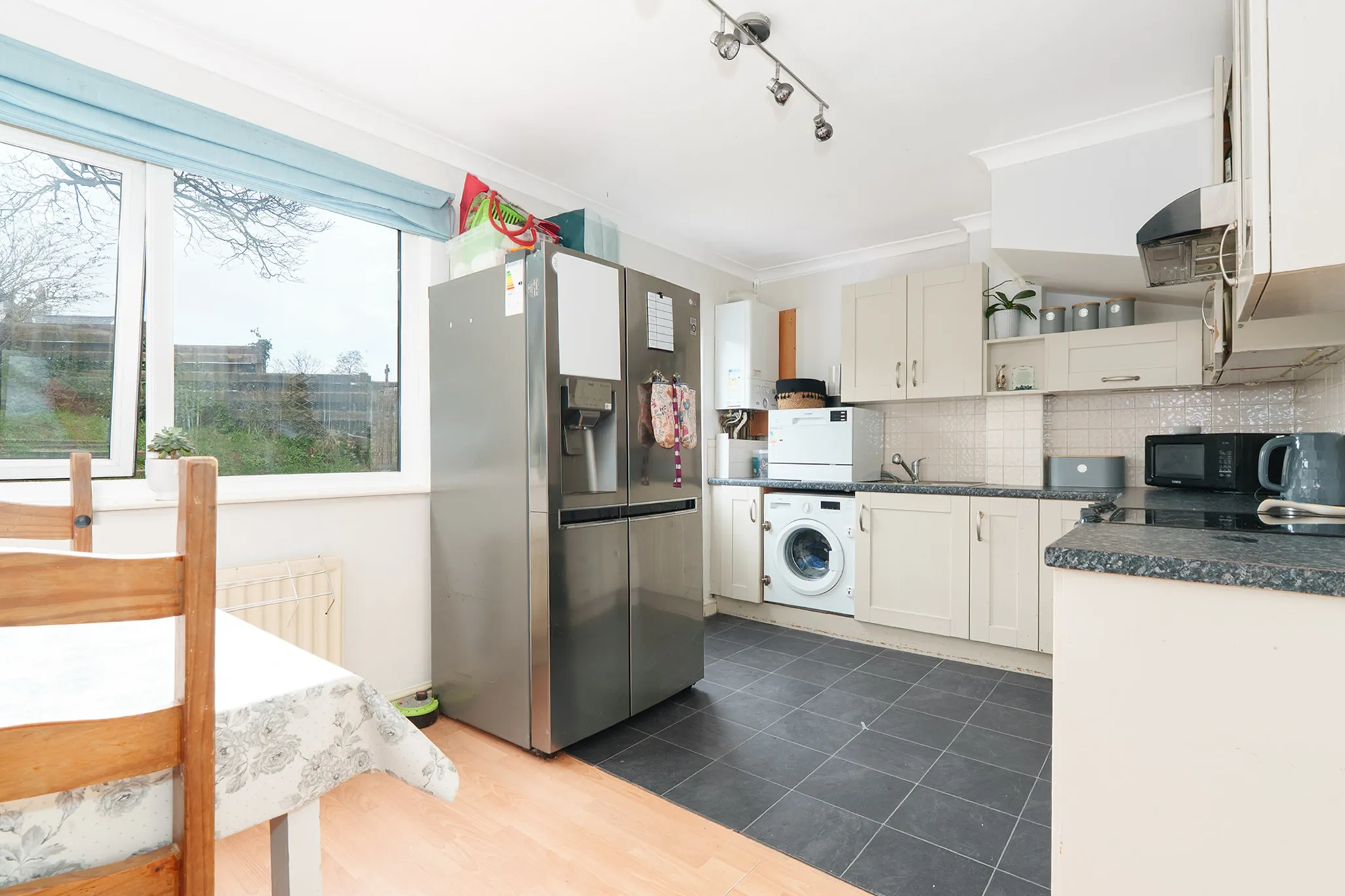 The ground floor accommodation comprises a comfortably sized lounge, an inviting space for relaxing or informal gatherings. To the rear, the kitchen-diner provides a practical and sociable layout, with patio doors opening directly onto the garden, allowing for seamless indoor-outdoor living during the warmer months.