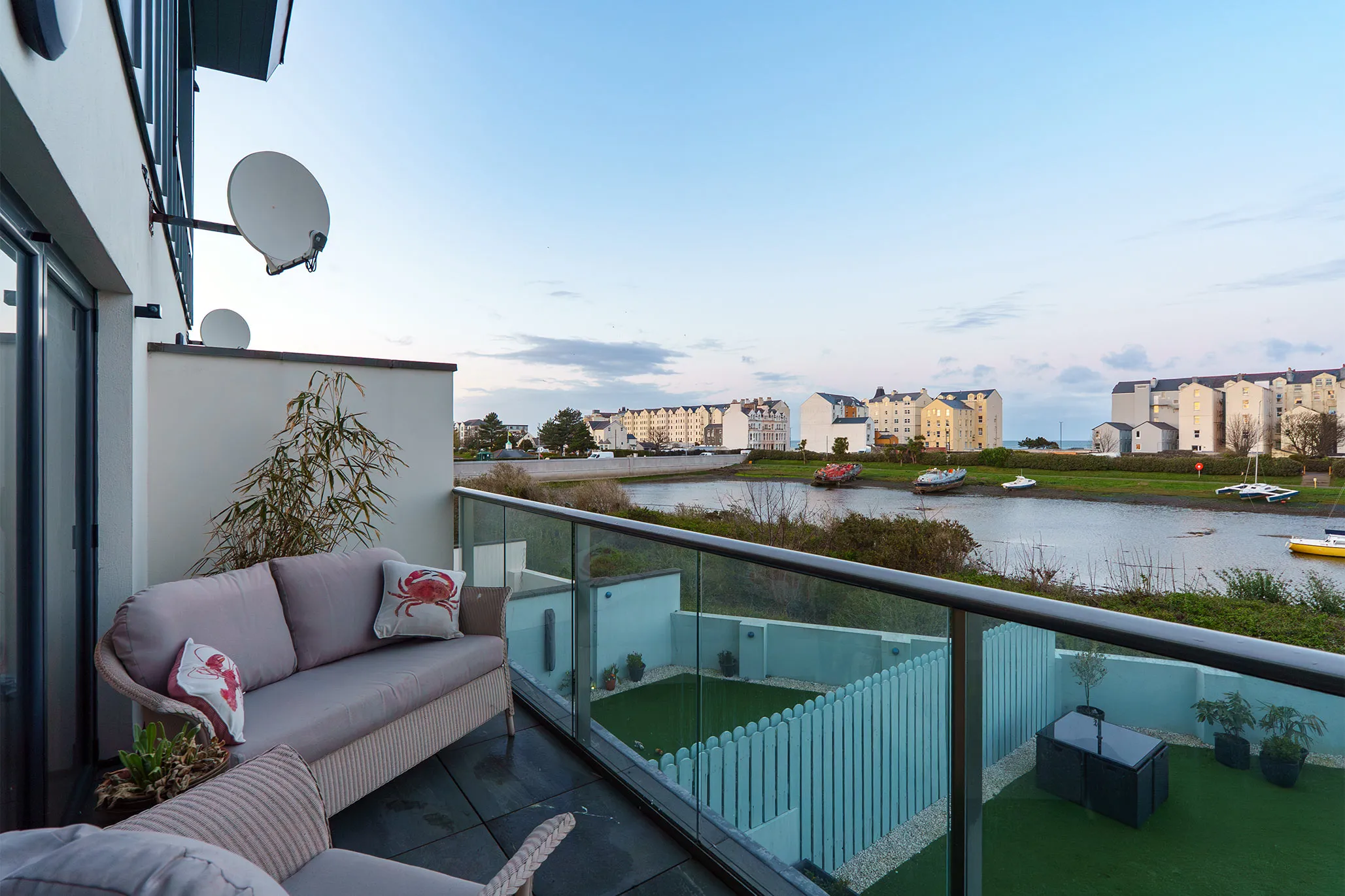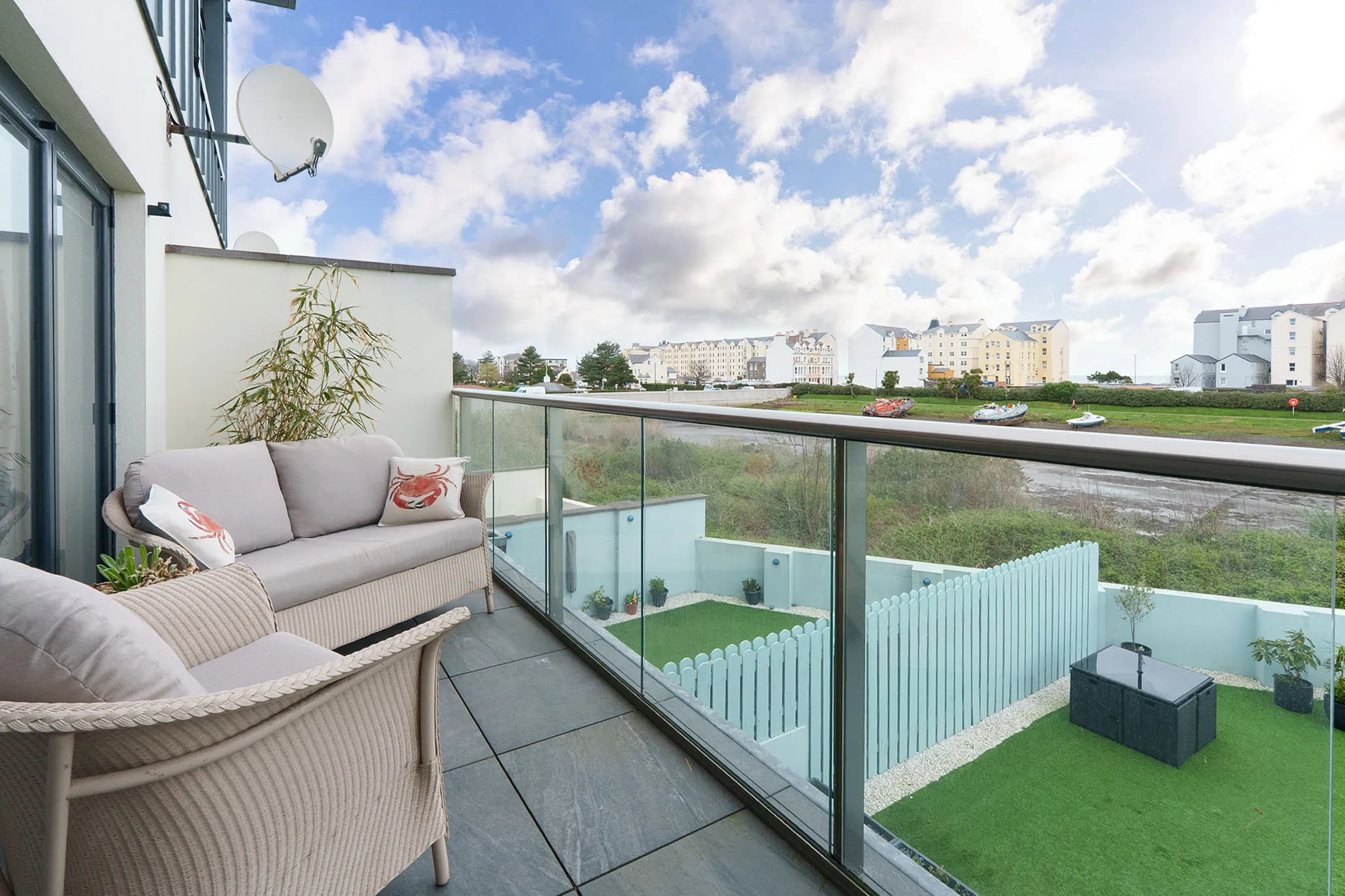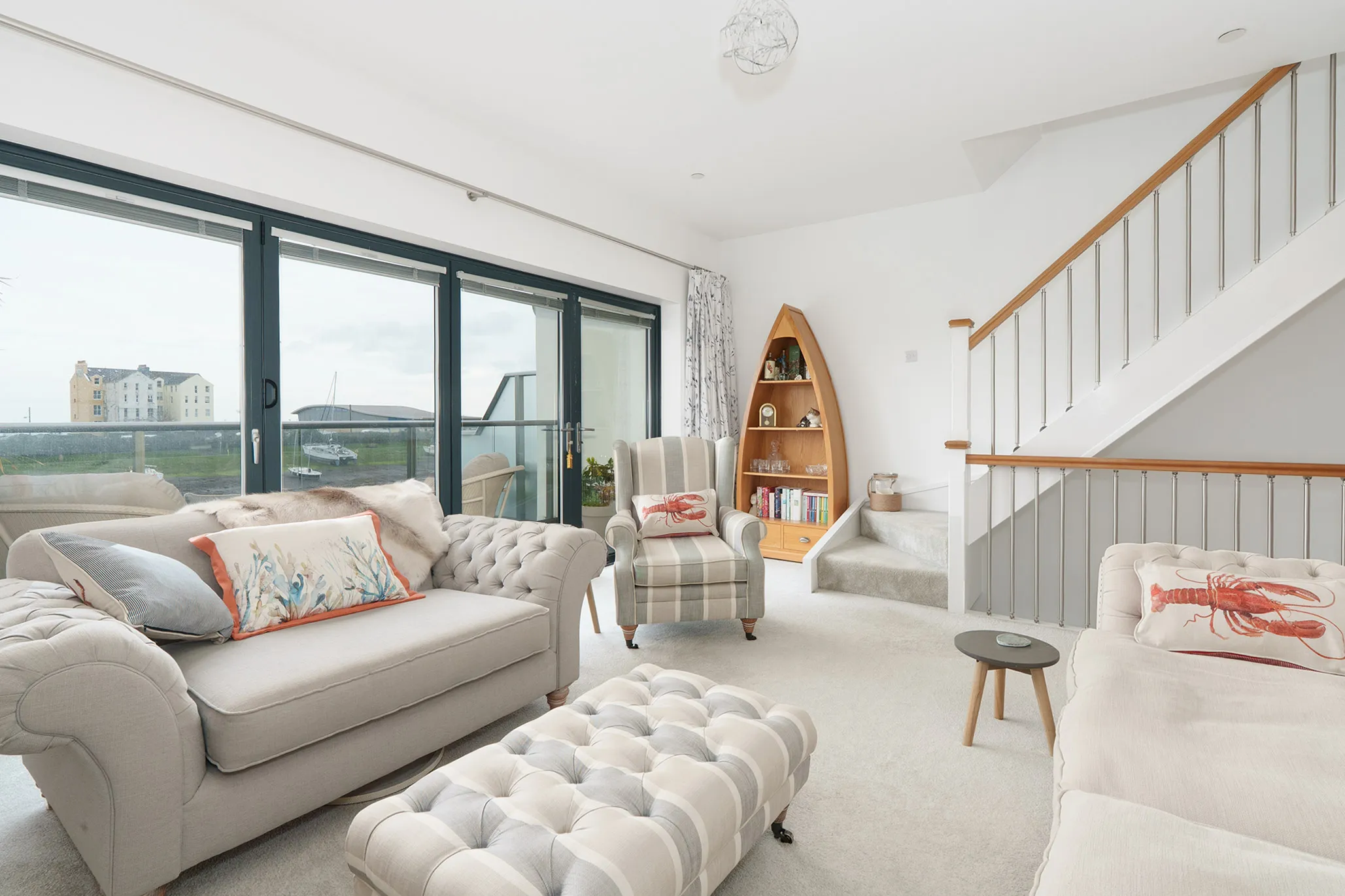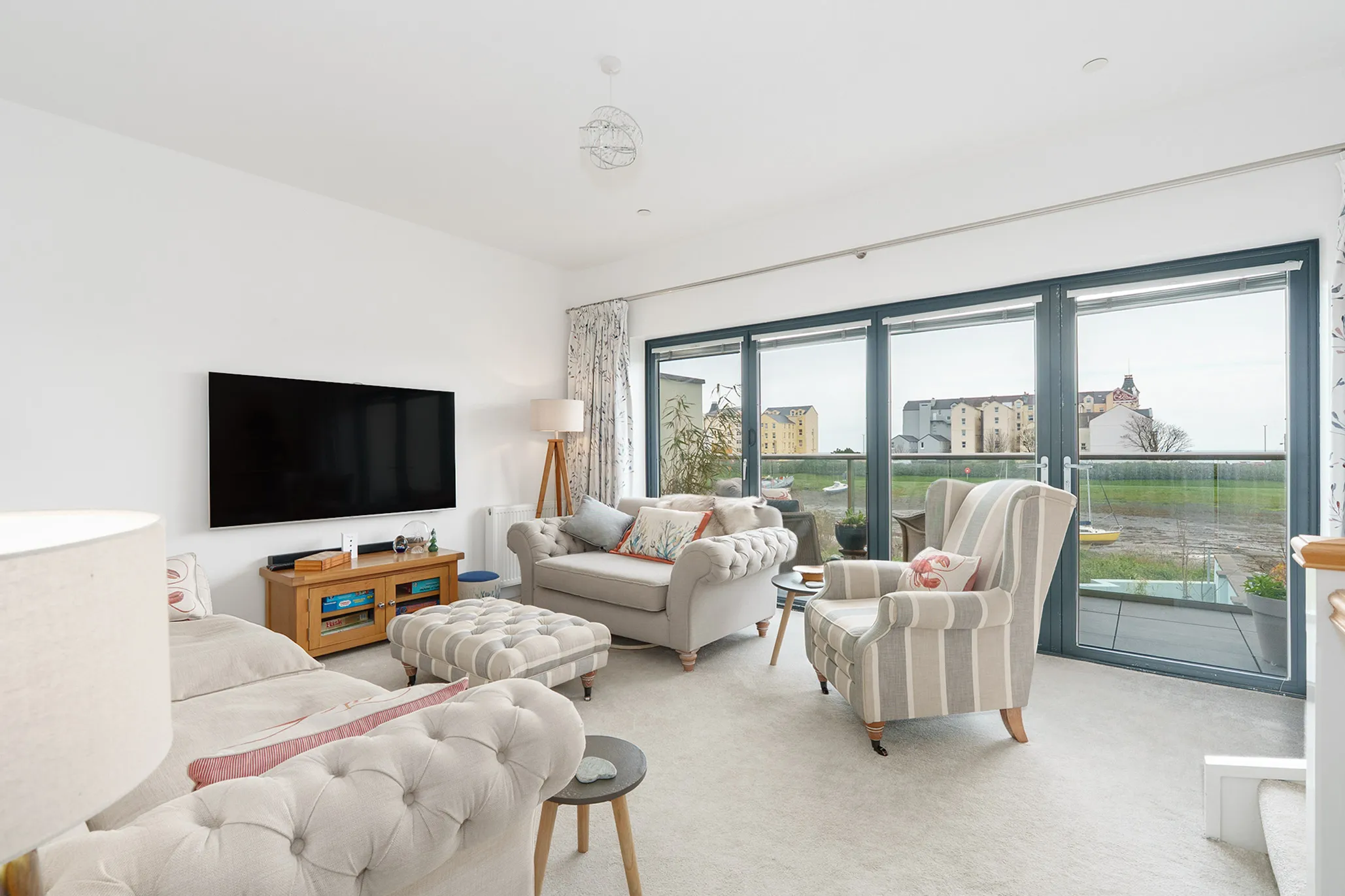 - Lovely first floor living room with a further set of bi-folding doors to the balcony with amble space for table and chairs, enjoying the fabulous elevated harbour views