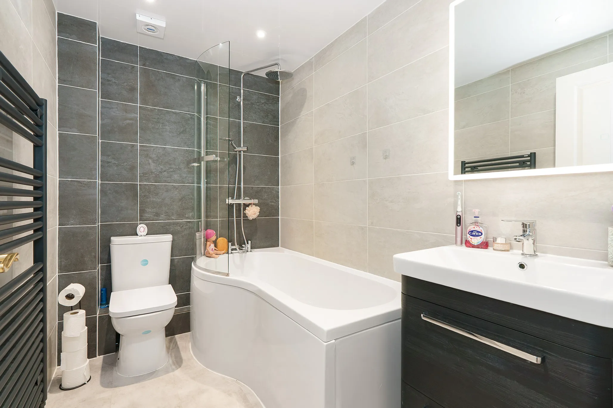 To the first floor are three bedrooms and a modern family bathroom.