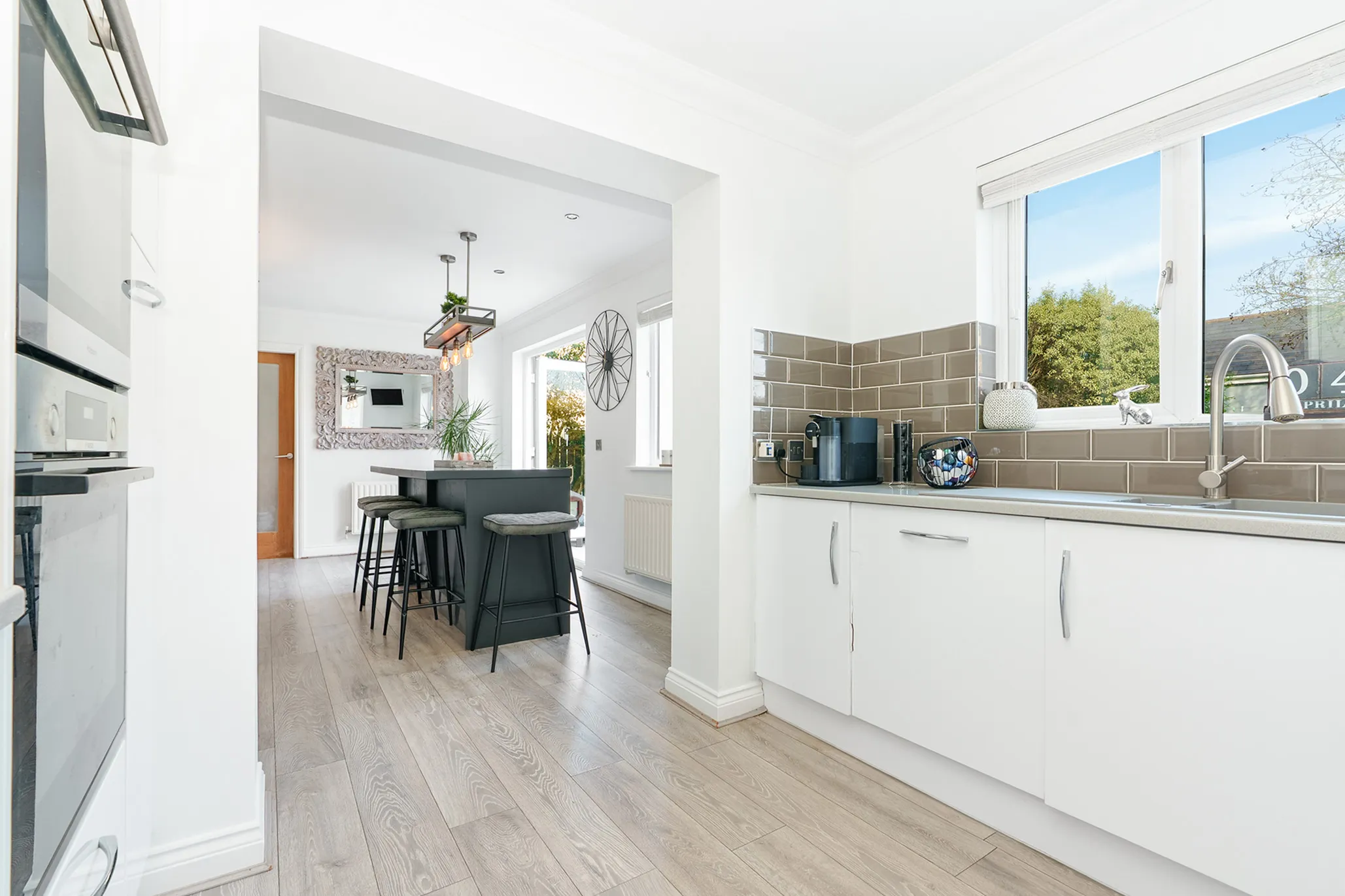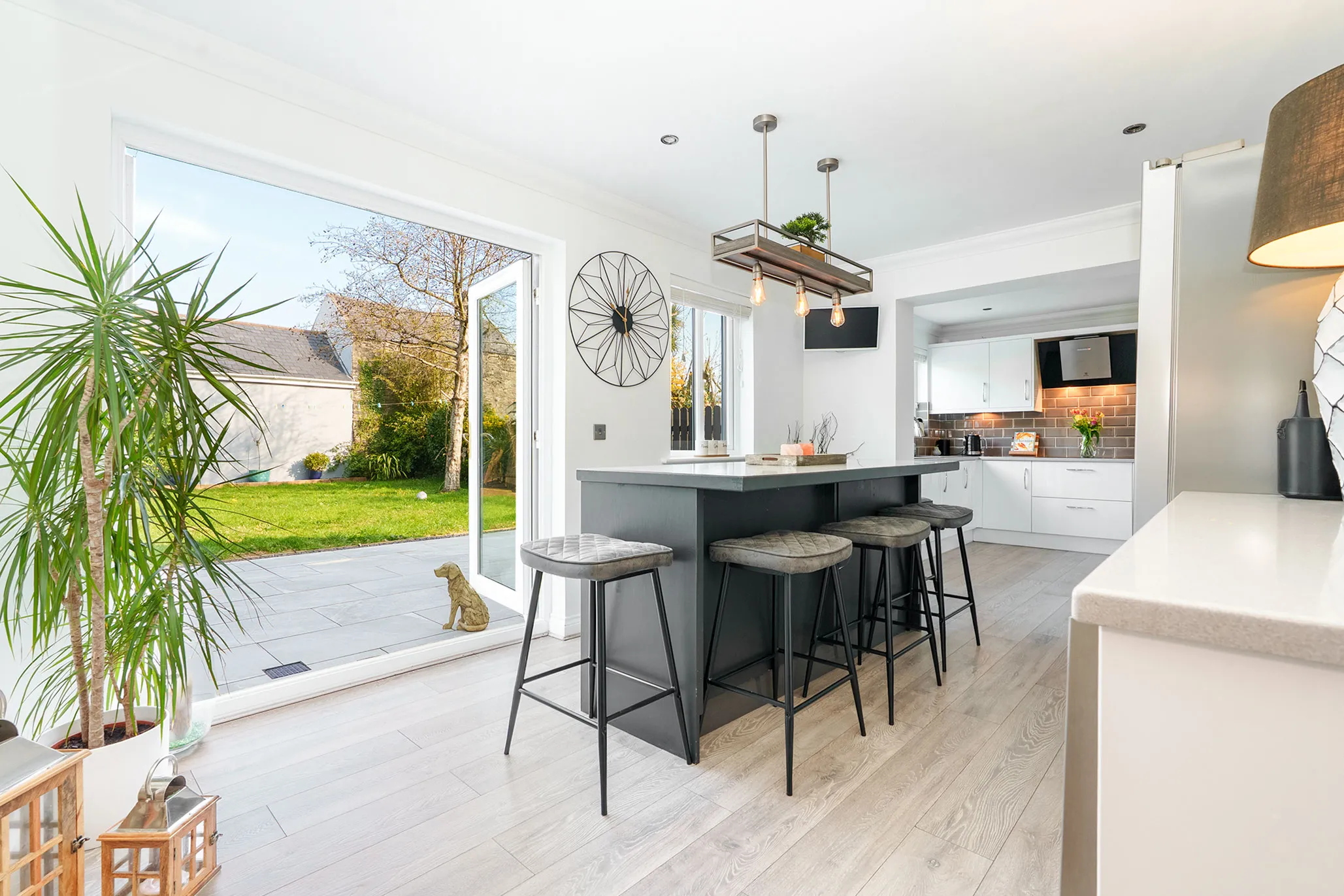- Stunning ultra modern kitchen with island unit and breakfast bar overlooking the landscaped rear garden